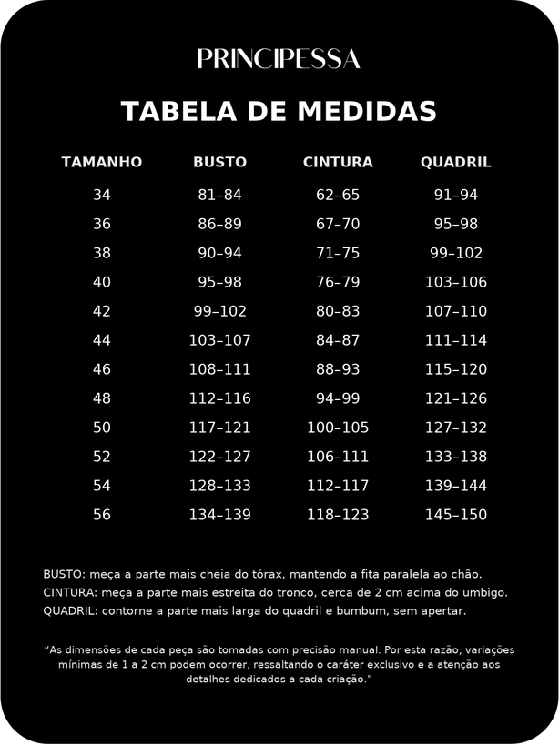 Composição: 95% Poliéster e 05% Elastano; Forro: 100% Poliéster.