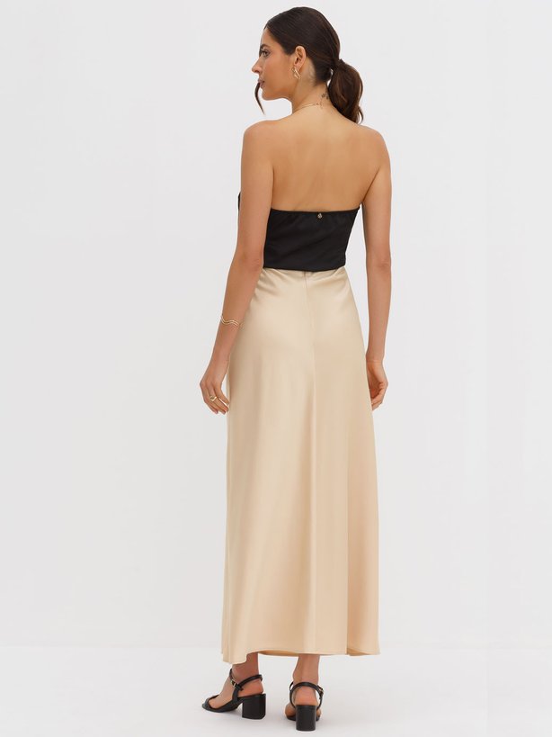 A blusa Mariane é confeccionada em cetim, um tecido com caimento fluído e que se adapta bem ao corpo, realçando as curvas elegantemente. A escolha do cetim não somente ressalta a beleza, mas também proporciona um toque suave à pele. Sua modelagem é levemente acinturada, possui forro na parte superior da frente, tem pences de busto e oferece liberdade de movimento sem comprometer o visual. O grande diferencial desta peça está no aviamento na região do pescoço: uma choker dourada que pode ser utilizada tanto como parte da peça como um acessório à parte. O fechamento do acessório é feito por um pequeno gancho com extensor de correntinha, onde é possível regular.