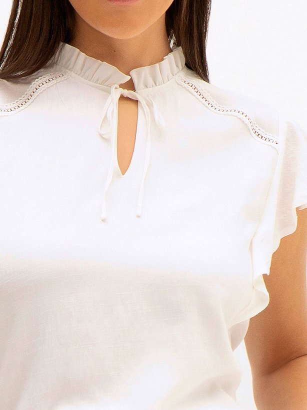 A Blusa Giulia é confeccionada em tecido de viscose com poliéster na sofisticada cor off white. Com modelagem solta e comprimento tradicional, é ideal para ser usada tanto por fora quanto por dentro da calça, oferecendo versatilidade ao look. O charme da peça está nos babados aplicados na gola e nas mangas, que adicionam um toque feminino e romântico ao visual. Outro destaque é o entremeio aplicado na parte frontal, logo abaixo dos ombros, que harmoniza com o decote em V, finalizado com cadarço do próprio tecido para amarração em laço. Na parte de trás, a blusa traz a exclusiva placa monograma da marca aplicada na gola, garantindo um acabamento refinado.