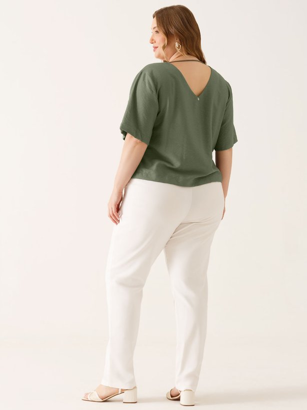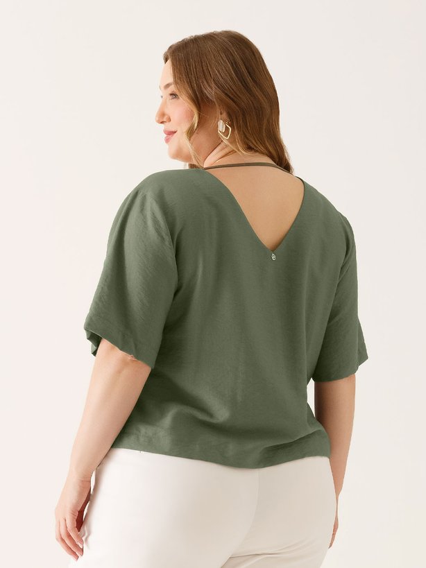 A blusa Rafaella verde em viscose é versátil e elegante, com decote em V que alonga a silhueta e mangas médias que trazem conforto e praticidade. O tom verde suave reforça sua modernidade, tornando-a ideal tanto para o dia a dia quanto para composições mais sofisticadas.