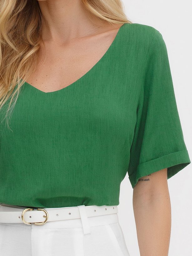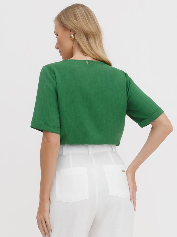 A blusa Osira possui modelagem reta, mais solta ao corpo e mangas curtas. A peça apresenta decote redondo e pence no busto, garantindo melhor ajuste ao corpo. As mangas curtas têm um comprimento um pouco mais alongado, com punho duplo com acabamento, criando um visual limpo e moderno. Confeccionada em tecido de viscose com textura suave, proporciona um caimento agradável e elegante. A cor apresentada é um tom de verde-esmeralda, que transmite modernidade e leveza. Essa paleta é extremamente alinhada à estética contemporânea e combina com tanto com tons mais claros como off white, como com tons mais escuros como o preto. Pode ser usada com jeans, alfaiataria, saias midi ou até por baixo, coletes e casacos. Perfeita para produções do dia a dia, tanto em looks mais básicos quanto em combinações mais sofisticadas com acessórios.