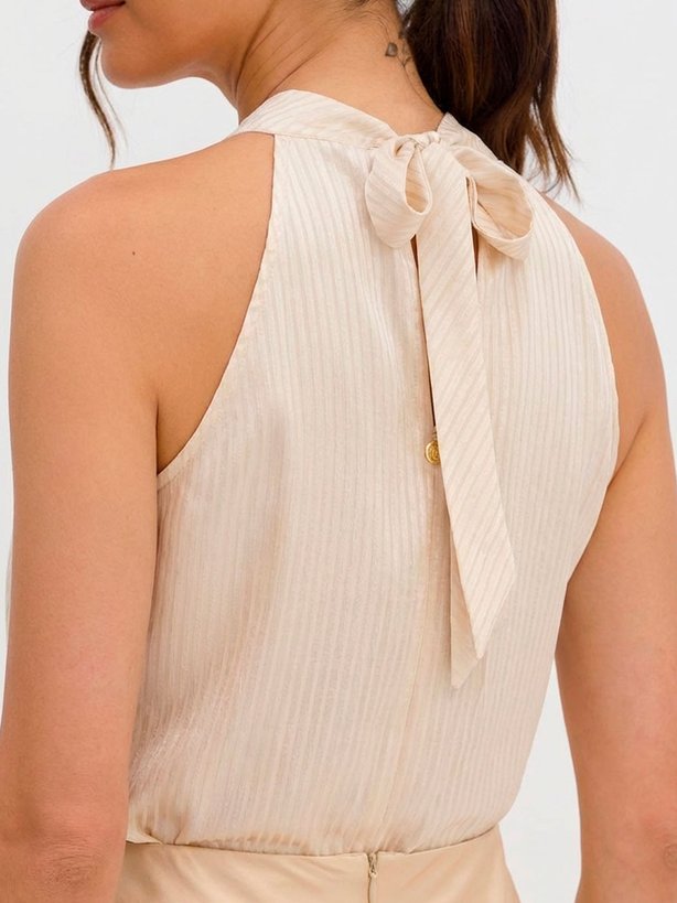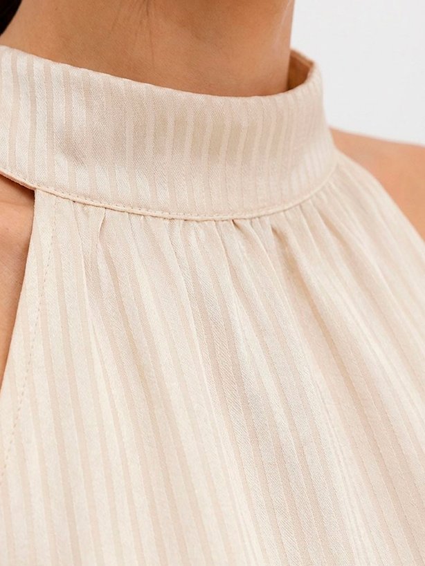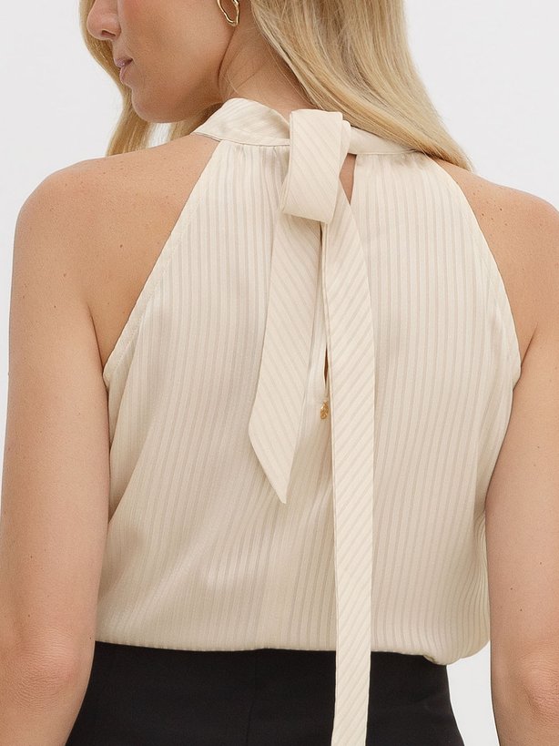 A blusa Nataniely é uma peça sofisticada e versátil, confeccionada em crepe texturizado leve e fluido, garantindo ótimo caimento e conforto. Com design moderno, possui decote alto com pregas delicadas, que trazem elegância e movimento ao visual. O modelo possui cava americana, levando o detalhe para a gola anatômica que faz laço na região das costas, entregando leveza à peça, com uma elegância única. A textura discreta em listras horizontais alonga a figura, proporcionando um toque refinado e atemporal. Ideal para composições tanto casuais quanto sociais, sendo perfeita para o trabalho ou ocasiões especiais.