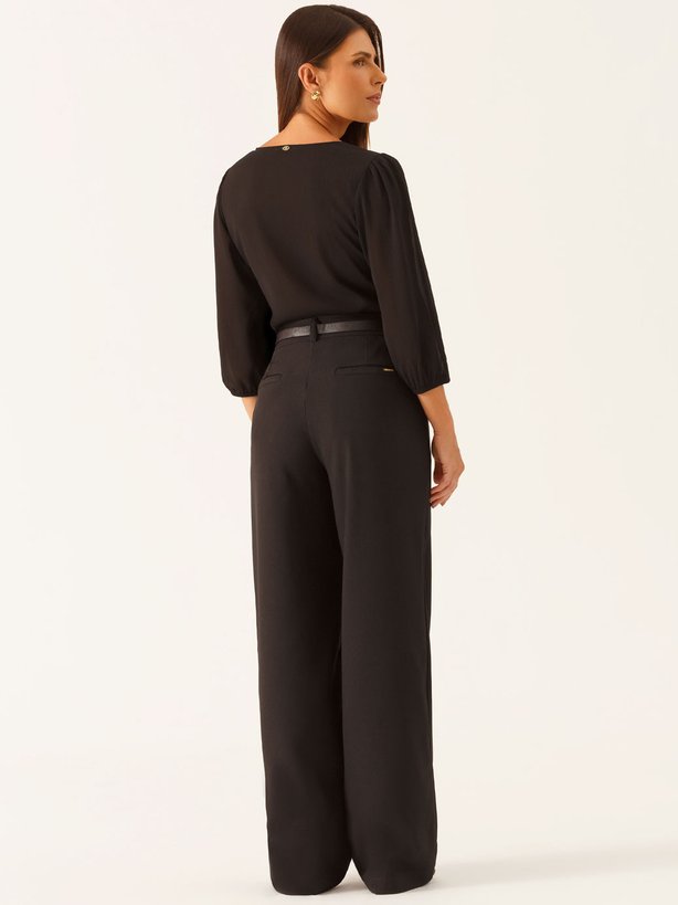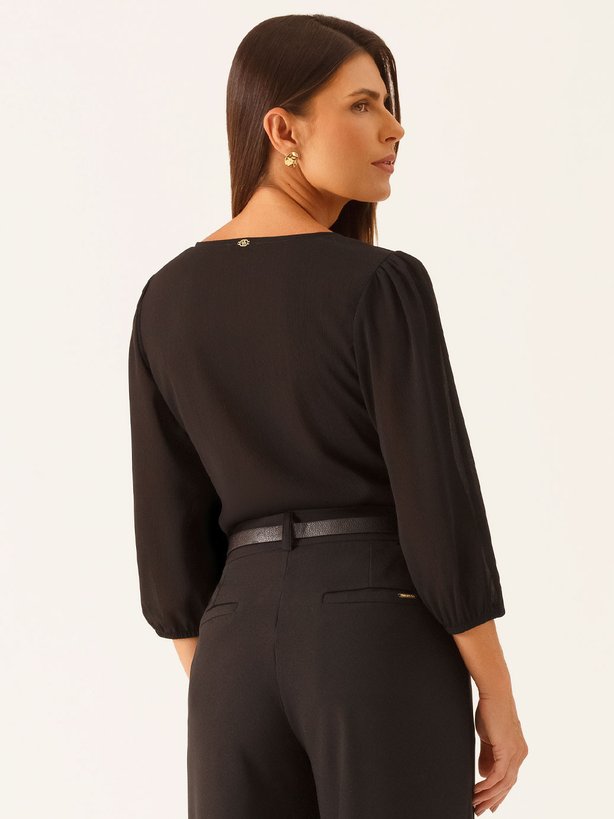 A blusa Elidiane é confeccionada em crepe texturizado, tecido que acrescenta elegância e riqueza de detalhes ao visual, além de proporcionar leveza com sofisticação. Sua superfície sutilmente trabalhada valoriza o acabamento e confere profundidade à peça. Apresenta design sofisticado com decote assimétrico, que imprime modernidade à composição, aliado ao delicado detalhe de pregas no ombro, responsável por agregar charme e estrutura ao modelo. As mangas 7/8 em tecido transparente possuem leve efeito bufante, com franzido aplicado no ombro e no punho, criando volume na medida certa e um visual feminino e elegante. Os punhos contam com elástico, garantindo conforto e praticidade ao vestir. A peça é forrada, proporcionando melhor acabamento e segurança, sem comprometer a fluidez do tecido. Com modelagem leve e caimento delicado, a blusa Elidiane é ideal para composições elegantes e sofisticadas, valorizando detalhes sutis e femininos com refinamento.