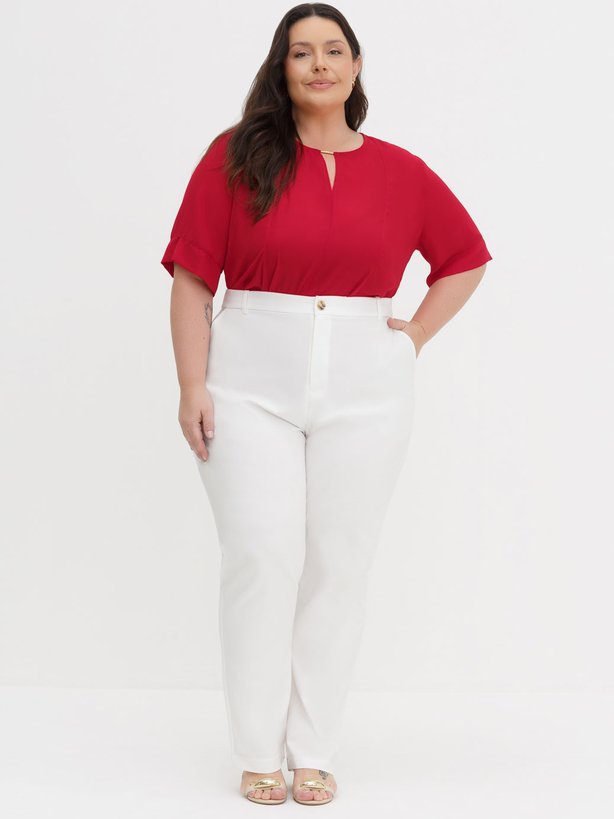 A blusa Nadina é a escolha perfeita para quem busca praticidade sem abdicar da elegância. Confeccionada em crepe, um tecido leve, fluido e de fácil cuidado, garantindo caimento sofisticado e conforto ao vestir. O design apresenta decote redondo com abertura discreta em V com canutilho dourado, que valoriza o colo de maneira delicada. A modelagem levemente solta ao corpo proporciona versatilidade, sendo ideal para combinações que vão do dia a dia ao trabalho. Na cor vermelha, a Nadina transmite força, confiança e estilo, funcionando como peça-chave em produções tanto casuais quanto sofisticadas, quando coordenada com saias, calças de alfaiataria ou acessórios marcantes.