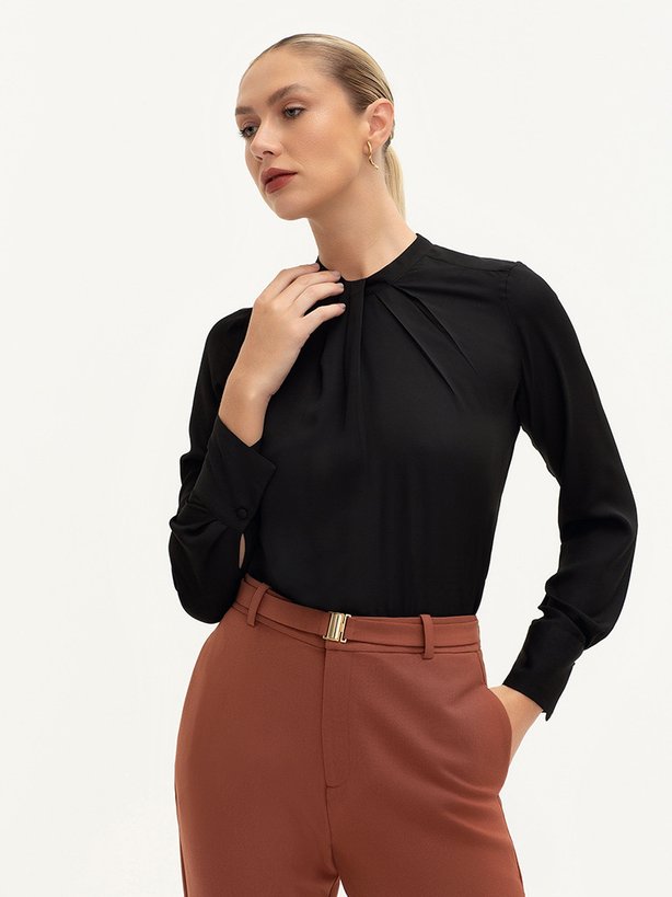 A blusa Vivi é uma peça que transmite elegância. Com modelagem mais solta ao corpo, os detalhes especiais que entregam o diferencial dessa peça estão nos botões forrados e em sua gola com detalhe de pregas frontais, que entregam elaboração e sofisticação. Desenvolvida no tom de preto, é versátil e atemporal. Combine com calça de alfaiataria ou saia, para um look mais elegante, podendo ainda ser usada por baixo de outra peça, com blazer, em sobreposição, por exemplo. Ideal para compromissos que exigem uma imagem alinhada, como ambientes de trabalho, jantares ou eventos formais. Adicione acessórios dourados para elevar os detalhes da peça.