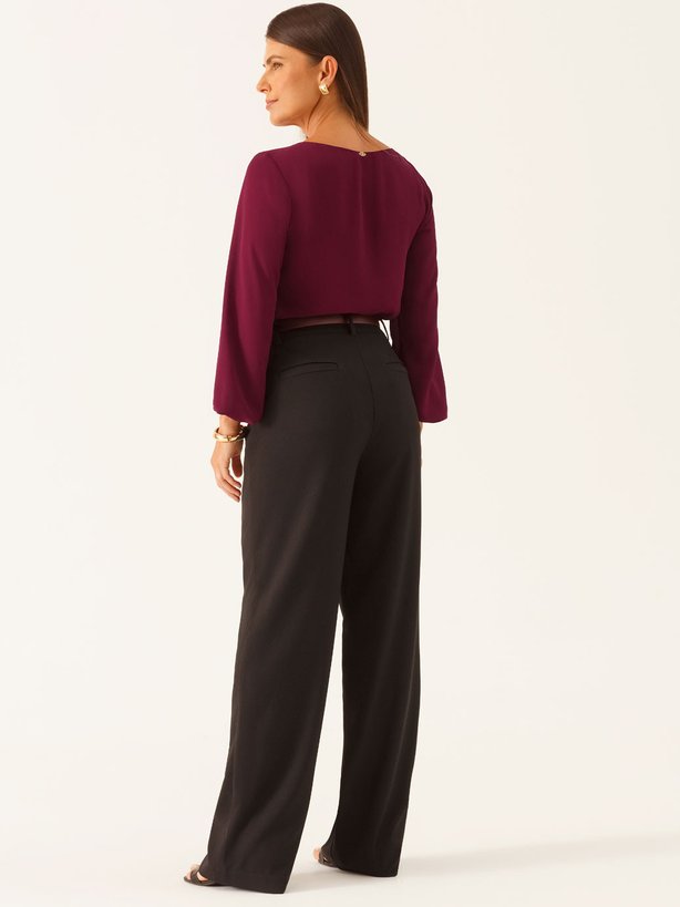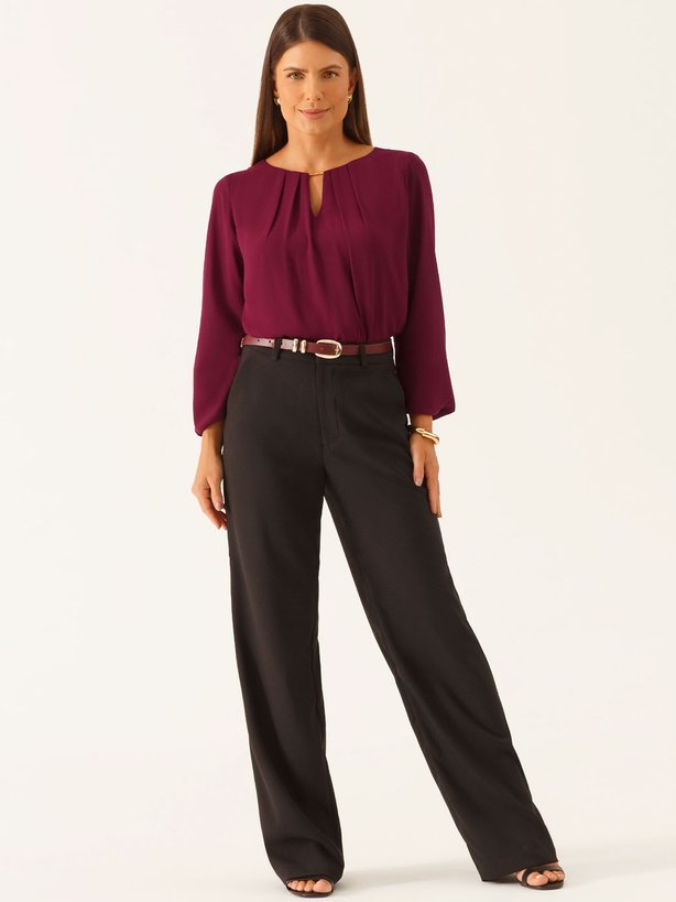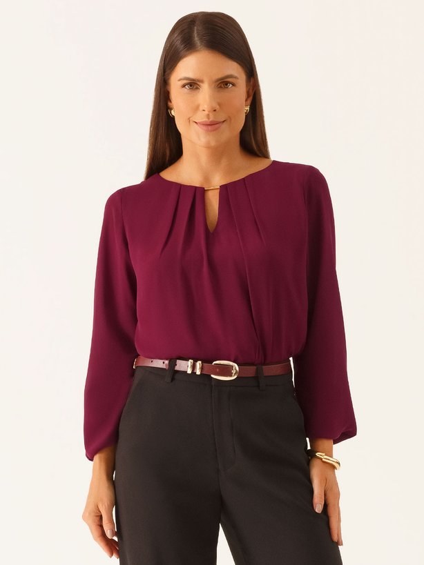 A blusa Eliandra é confeccionada em tecido leve e fluido, na sofisticada cor vinho, proporcionando um caimento solto que garante conforto e movimento natural ao vestir. O aviamento dourado aplicado no decote é um detalhe delicado que transmite sofisticação e valoriza a peça com um toque refinado. Possui frente forrada, oferecendo melhor acabamento e segurança, além de mangas levemente bufantes no punho, que conferem charme e modernidade ao visual. Os punhos contam com elástico, abertura funcional e botão com monograma da marca, assegurando conforto, praticidade e um acabamento elegante. Sua modelagem moderna e delicada torna a blusa ideal para composições elegantes no dia a dia, enquanto a tonalidade vinho reforça sua versatilidade, permitindo combinações que transitam com facilidade do casual ao sofisticado.