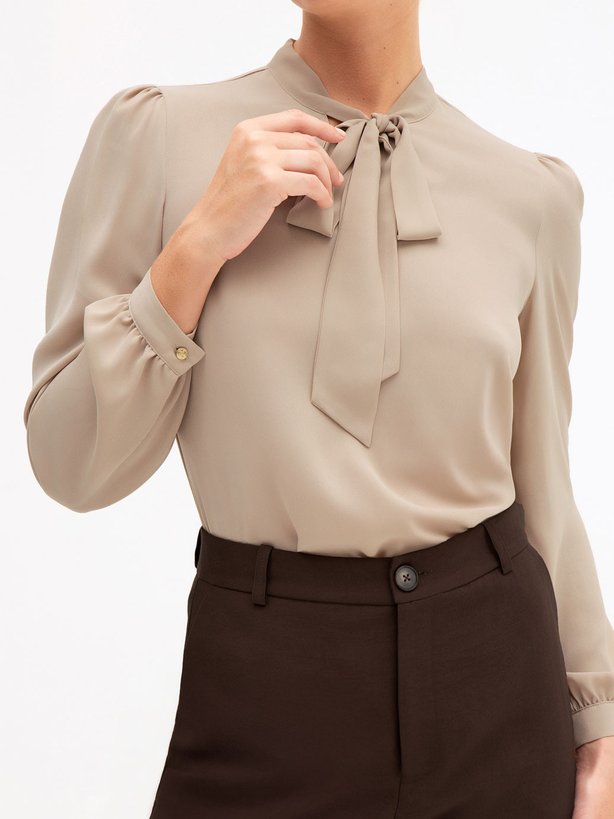 A blusa Gabriella é confeccionada em crepe basic, um tecido leve e com caimento fluido, que proporciona elegância. Com comprimento tradicional, apresenta uma modelagem solta, levemente acinturada e conta com pences no busto para um ajuste mais perfeito ao corpo. As mangas são franzidas, com punhos de 3 cm e botão dourado personalizado com monograma, adicionando um toque de sofisticação. O grande destaque da peça está em sua gola laço, que também pode ser usada solta em forma de gravata, oferecendo diferentes possibilidades de estilo. Como acabamento, na gola costas possui uma placa monograma personalizada, reforçando a exclusividade da peça. Uma escolha perfeita para composições elegantes e versáteis.