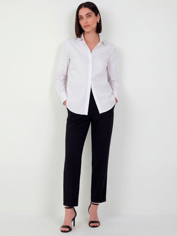 Calça Reta Slim de Alfaiataria com prega Donatela - Feita em Tecido de Alfaiataria, com Cintura Média Desenvolvida tecido plano de alfaiataria, a Calça Reta Preta é leve e maleável. Possui corte reto, cintura média com passantes e modelagem de alfaiataria. Seu principal detalhe está no cós com vista clean, com fechamento através de dois ganchos e botão interno transparente. Na parte frontal possui pregas e bolsos funcionais em faca.
