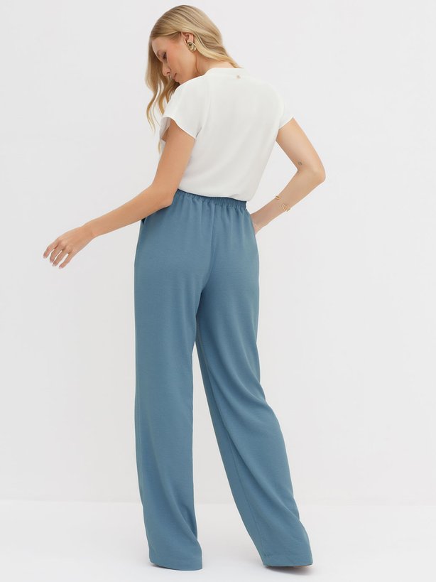 A calça Hanna, na cor azul, é confeccionada em tecido leve com toque fresco, ideal para dias de clima ameno. Sua modelagem wide leg garante caimento solto e elegante, proporcionando conforto desde a coxa até a barra. Para melhor vestibilidade, o cós nas costas conta com elástico, enquanto a parte frontal apresenta cós liso com falsa braguilha, criando um visual clean e sofisticado. O bolso faca acrescenta praticidade ao design, e a placa metálica personalizada com o monograma Principessa, aplicada na parte traseira, confere um detalhe exclusivo e refinado à peça.