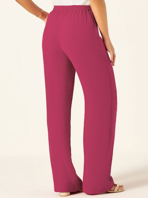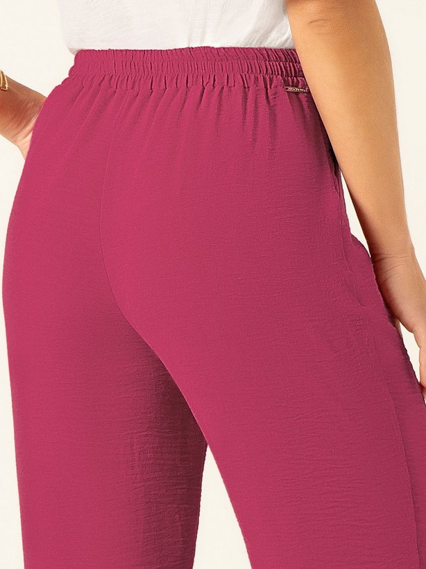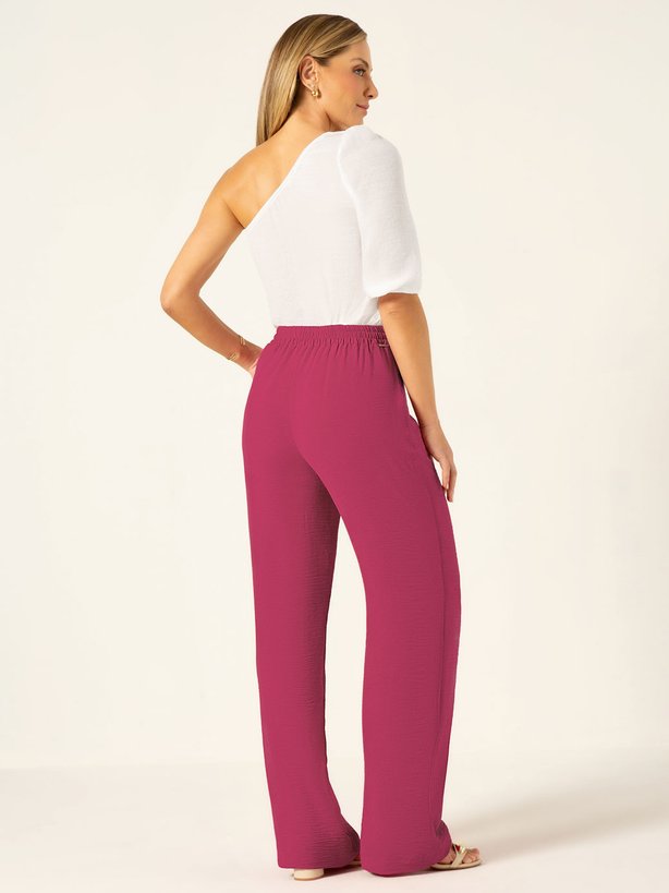 A calça Hanna na cor rosa é confeccionada em crepe que é um tecido leve e fluído, com toque fresco, ideal para os dias mais quentes e que não amassa com facilidade. Com modelagem wide leg, proporciona um caimento fluido e confortável, indo da região da coxa até a barra. O cós costas com elástico garante maior conforto e um ajuste perfeito ao corpo. Na frente, possui cós liso com falsa braguilha e o bolso faca adiciona funcionalidade, enquanto a placa personalizada na parte traseira, com o monograma Principessa, confere um toque de sofisticação à peça.