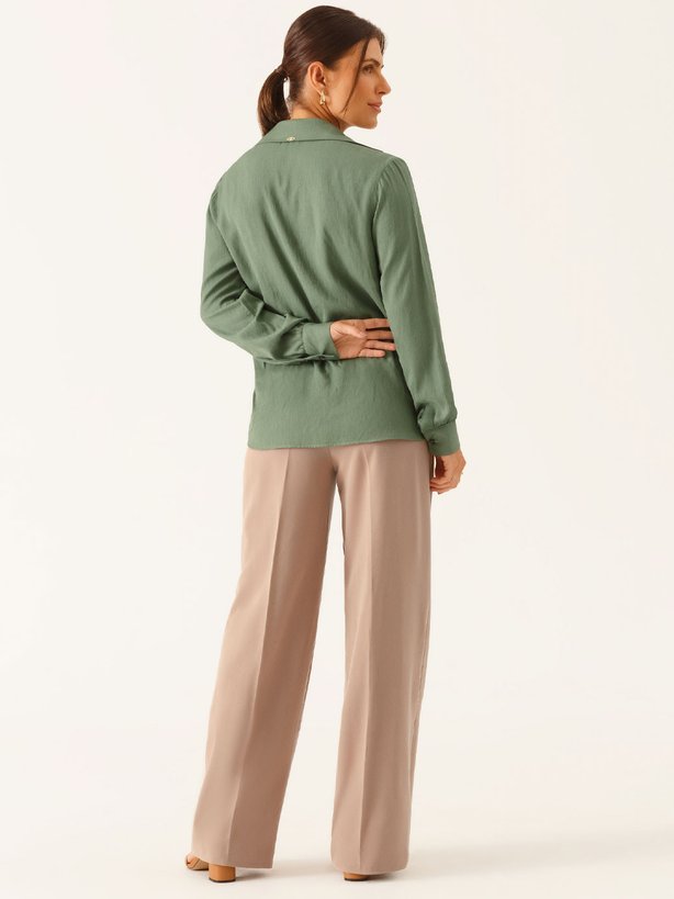 A calça Angelica é confeccionada em alfaiataria de viscose, poliéster e elastano e apresenta uma modelagem wide leg, com caimento solto ao corpo desde a região da coxa até a barra. A calça possui bolso invisível funcional nas laterais e falsos bolsos embutidos traseiros com placa dourada personalizada da marca. O vinco de passadoria e o discreto fechamento por colchetes internos de metal fazem com que a peça se destaque pelos seus detalhes cuidadosamente pensados. Além disso, a peça conta com presilhas e acompanha cinto, desenvolvido no mesmo tecido do corpo, e uma fivela dupla em meia argola dourada que eleva a peça a um visual sofisticado, assinando a produção.