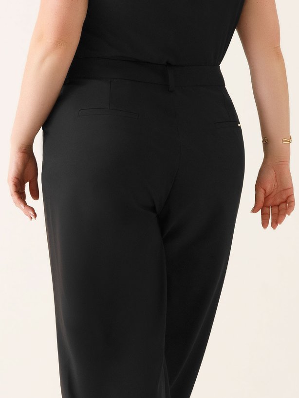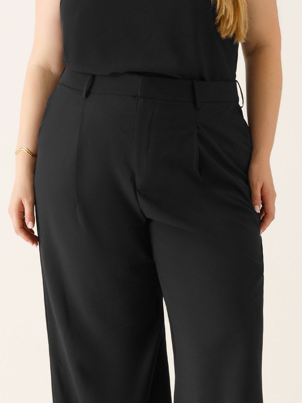 A calça wide leg preta de alfaiataria Evelyn é confeccionada em tecido plano creponado, com caimento único. Sua modelagem é de cintura alta com passante para cinto. Possui bolso faca frontal funcional e bolso falso traseiro. Destaque especial para a placa de metal com gravação Principessa aplicada no bolso costas, finalizando o seu design com toda a autenticidade da marca.
