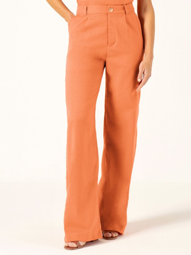 A Calça Hadassa é confeccionada em tecido natural fresh uma base que contêm linho em sua composição, a mistura do linho com outras fibras pode melhorar a resistência do tecido e aumentar o seu conforto. Apresenta modelagem Wide Leg com caimento solto ao corpo desde a região da coxa até a barra. A calça possui detalhes como bolso faca funcional e presilhas no cós. O fechamento frontal do cós é feito por um botão rajado em cor clara, o contraste delicado entre o botão e o linho cria uma harmonia visual que é ao mesmo tempo moderna e atemporal. Na parte traseira do cós, conta com placa personalizada da marca e pences que proporcionam uma melhor vestibilidade.