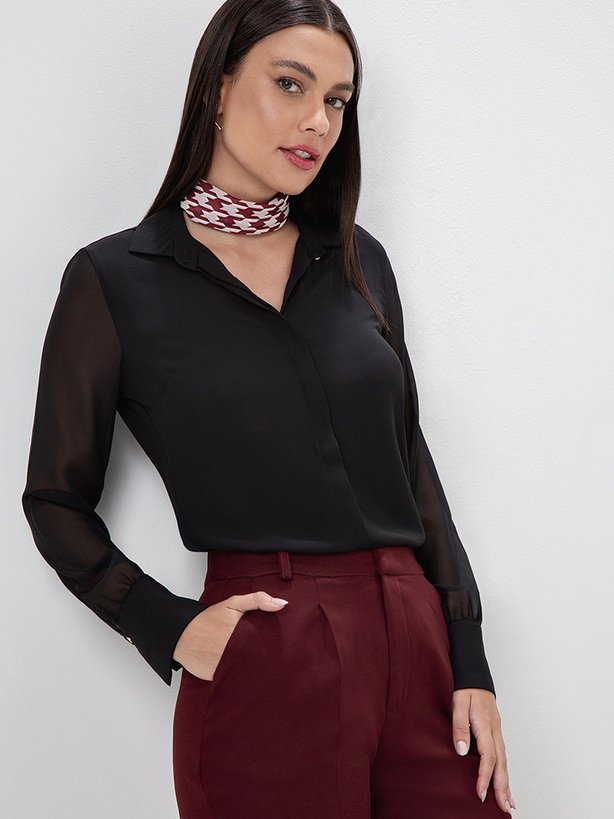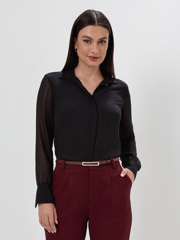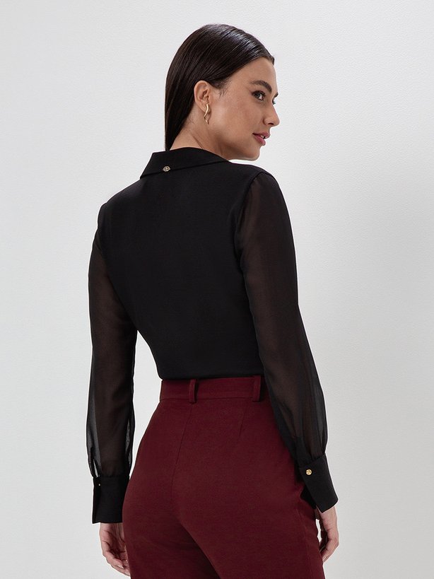 A camisa Tiara é uma peça sofisticada, o seu tecido levemente texturizado no corpo traz um toque elegante e estruturado ao visual. As mangas longas, com transparência, adicionam feminilidade, leveza e um ar sensual sem exagero, equilibrando sofisticação e modernidade. A camisa preta é uma peça versátil e atemporal, podendo ser usada em diversas ocasiões, como trabalho e reuniões formais, eventos sociais e jantares. Pode ser combinada com saias elegantes e calças de alfaiataria, ou até mesmo compor em um look casual chic quando usada com um jeans e mocassim. Para refinar o look, pode ser usada com peças na mesma cor, mantendo um visual minimalista e monocromático.
