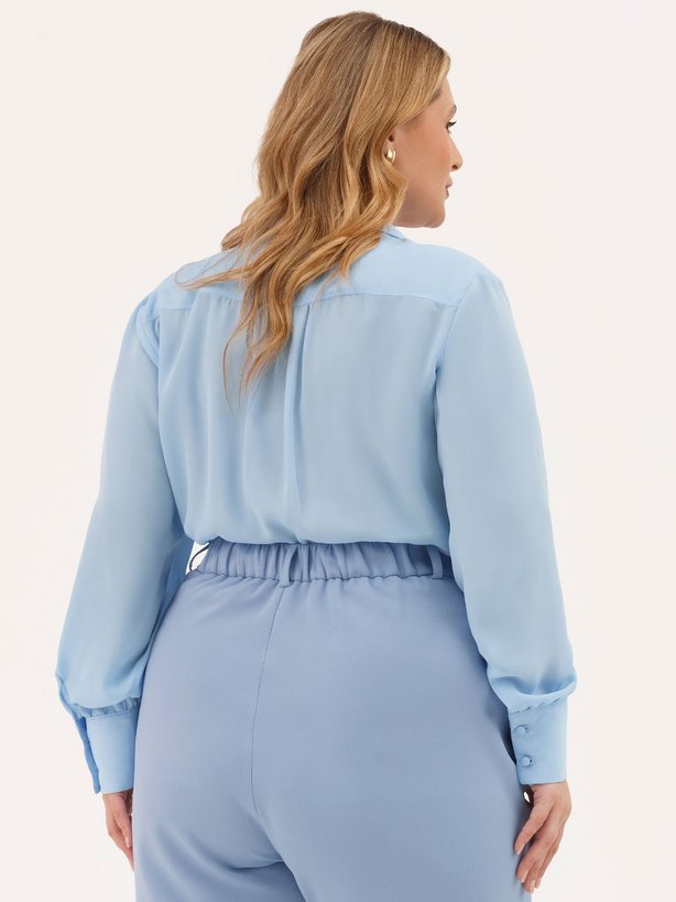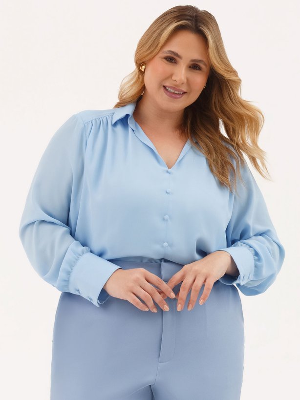 A blusa Lari é confeccionada em crepe fluido, um tecido maleável e versátil que proporciona leveza e movimento ao vestir. Sua modelagem de comprimento tradicional é levemente solta ao corpo, garantindo conforto sem abrir mão da elegância. O decote em formato V valoriza o colo de maneira sutil e feminina. A peça cria a ilusão de uma camisa ao apresentar gola e pé de gola, trazendo um toque clássico ao design. Os botões forrados na parte frontal são decorativos, preservando a estética refinada da peça. Na frente, o corpo é duplo e recebe forro no mesmo tecido, assegurando acabamento impecável e evitando transparência. As mangas longas possuem punho largo com leve franzido e fechamento por botões forrados, acrescentando delicadeza aos detalhes. A pala nas costas se estende até a parte frontal dos ombros, finalizada com suaves franzidos, contribuindo para um caimento mais fluido e sofisticado. Elegante e versátil, a blusa Lari é ideal para composições alinhadas e produções contemporâneas, transitando com naturalidade entre o ambiente profissional e ocasiões especiais.