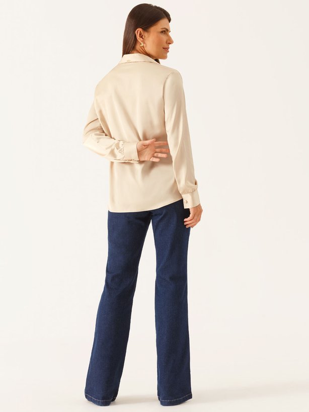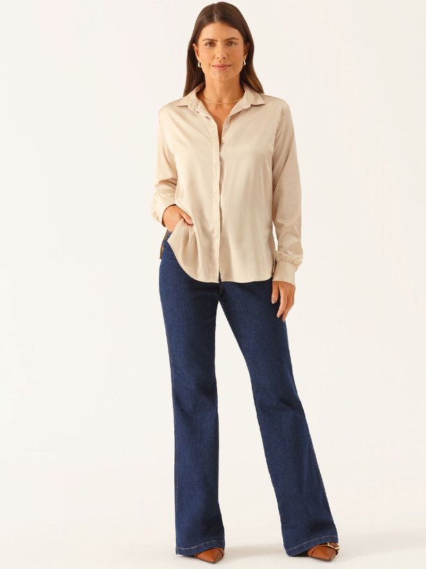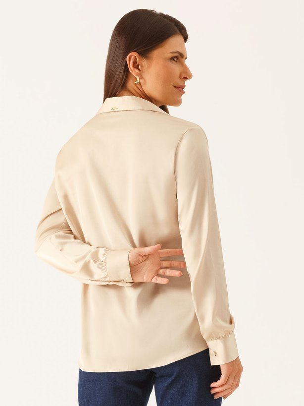 A camisa Váleri apresenta uma modelagem super comfy, com pences no busto e um caimento mais solto ao corpo. Confeccionada em cetim, possui um visual acetinado com leve brilho, toque macio e caimento impecável. Sua composição é de poliéster e elastano, que proporciona um conforto extra. A peça conta com vista coberta, criando um visual limpo e minimalista, além de botões forrados que acompanham o punho de 6 cm e o pé de gola, trazendo um toque moderno e sofisticado ao design. Nas laterais, a camisa possui fendas que garantem mais movimento à peça. Para finalizar, a gola na parte traseira conta com uma placa monograma personalizada, agregando exclusividade ao modelo.