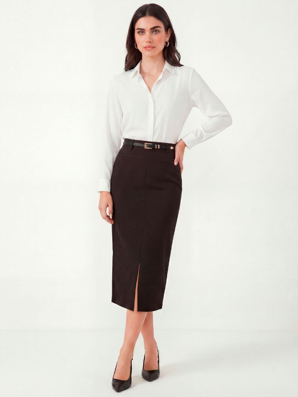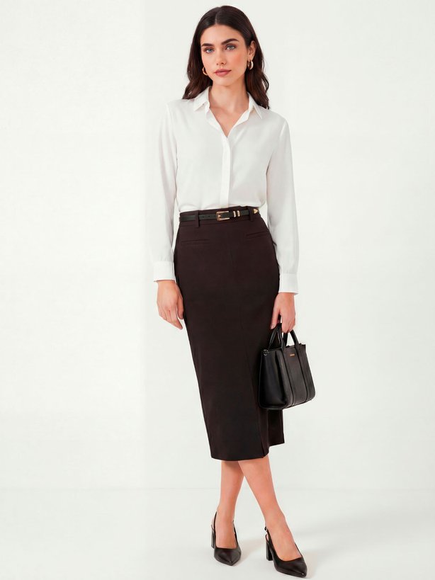 A camisa Helena na cor off-white traduz elegância atemporal em uma proposta clássica e refinada. Confeccionada em crepe de leve textura, oferece toque suave e caimento fluido, proporcionando conforto aliado a uma estética sofisticada. Sua modelagem tradicional reforça o caráter versátil da peça, garantindo encaixe equilibrado ao corpo e permitindo composições que vão do formal ao contemporâneo com naturalidade. A peça possui gola tradicional, com destaque especial para o pé de gola, finalizado com botão dourado personalizado com o monograma da marca — um detalhe exclusivo que valoriza o design com sofisticação. A vista frontal é coberta no mesmo tecido da camisa, criando acabamento limpo e discreto, enquanto os demais botões são personalizados na cor da peça, preservando a harmonia visual. As mangas longas apresentam punhos levemente franzidos, conferindo delicadeza ao visual. As pences abaixo da cava proporcionam melhor ajuste ao corpo, assegurando caimento impecável e valorizando a silhueta sutilmente. Clássica, feminina e versátil, a Helena é uma peça essencial para composições elegantes, transitando com naturalidade entre produções formais e combinações contemporâneas com alfaiataria.