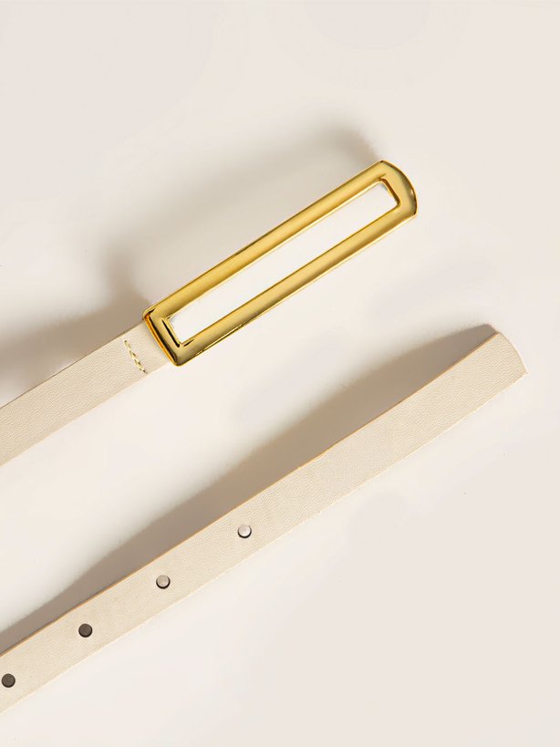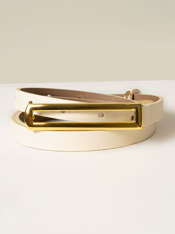 O cinto Liane é estreito e confeccionado em material sintético na cor aveia. Possui aproximadamente 1,3 cm de largura e conta com uma fivela retangular com um visual moderno, com a parte central vazada e fechamento por meio de pino. O modelo inclui um passante para manter a ponta do cinto rente ao corpo, garantindo um ajuste mais alinhado e confortável.