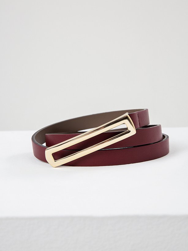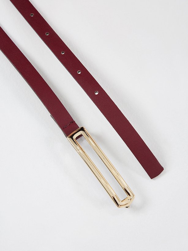 O cinto Liane Bordô é estreito e confeccionado em material sintético na cor bordô. Possui aproximadamente 1,3 cm de largura e conta com uma fivela retangular com um visual moderno, com a parte central vazada e fechamento por meio de pino. O modelo inclui um passante para manter a ponta do cinto rente ao corpo, garantindo um ajuste mais alinhado e confortável.