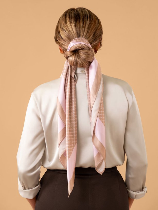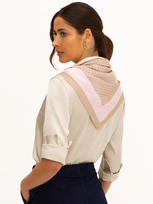 O lenço Luiza possui formato quadrado na dimensão de 90 cm x 90 cm, proporcionando versatilidade no uso. É desenvolvido em cetim, tecido leve e delicado. Ao redor, possui moldura em tom de nude que cria um contraste elegante com a estampa em tom de rosa. Este lenço é uma peça atemporal e muito versátil, podendo ser usado de diversas maneiras. O lenço agrega estilo ao visual, proporcionando combinações e detalhes diferentes ao look e várias formas de uso.