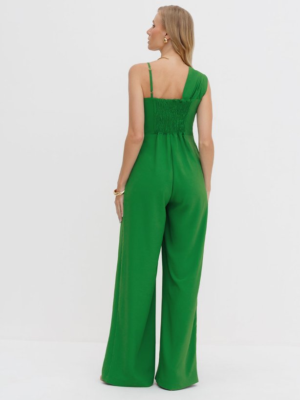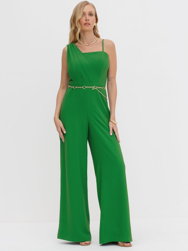 O macacão Natiela é uma peça que une sofisticação e modernidade em um design impactante. Confeccionado em crepe com poliéster, sendo um tecido que oferece fluidez, caimento elegante e praticidade, já que não amassa com facilidade. Seu modelo apresenta um ombro só com detalhe drapeado, criando uma silhueta assimétrica que valoriza a parte superior do corpo sofisticadamente. A cintura levemente marcada garante proporção equilibrada, enquanto a calça pantalona e alongada transmite imponência e conforto ao mesmo tempo. Em tom de verde profundo, a peça ganha personalidade e frescor, sendo ideal para ocasiões especiais que solicitam estilo e elegância em uma única escolha. O Natiela pode ser combinado com acessórios marcantes para produções noturnas ou com complementos minimalistas para um visual contemporâneo e refinado.