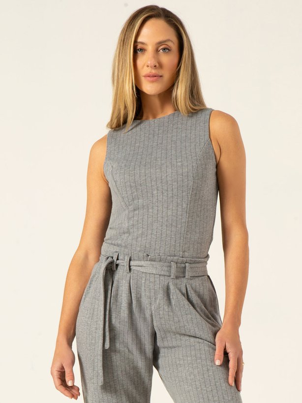A regata Fabiana é confeccionada em malha com leve elasticidade, proporcionando conforto e liberdade de movimento ao vestir. Sua modelagem levemente ajustada ao corpo valoriza a silhueta de forma sutil e elegante. O design sem mangas e o decote redondo conferem um visual clean e moderno, ideal para compor produções versáteis do dia a dia ao ambiente de trabalho. O tecido com padronagem risca de giz adiciona um toque sofisticado e atemporal à peça, remetendo à alfaiataria clássica com um ar contemporâneo. Possui pences frontais que garantem melhor caimento e acabamento impecável. Um essencial elegante e confortável, perfeito para quem busca praticidade sem abrir mão do estilo refinado.