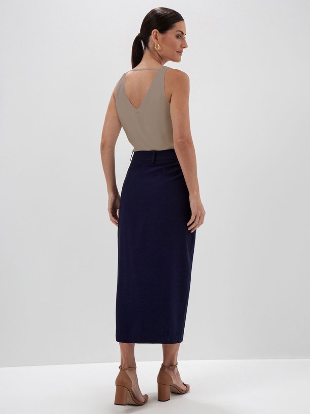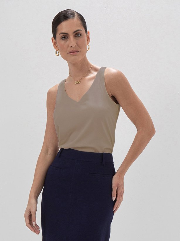 A regata Luma é uma peça essencial para o dia a dia, oferecendo inúmeras possibilidades de composição. Versátil, pode ser usada com uma calça de alfaiataria para um look clean e sofisticado ou combinada com uma terceira peça, como um blazer estruturado em produções elegantes. Na tonalidade verde oliva, a regata traz um atemporal, transmitindo sofisticação e modernidade. Essa cor versátil permite combinações refinadas com tons terrosos, criando um visual chic e equilibrado, ou com neutros como off-white, preto e marinho, garantindo harmonia e elegância. Para um toque extra de estilo, acessórios dourados complementam perfeitamente a produção.