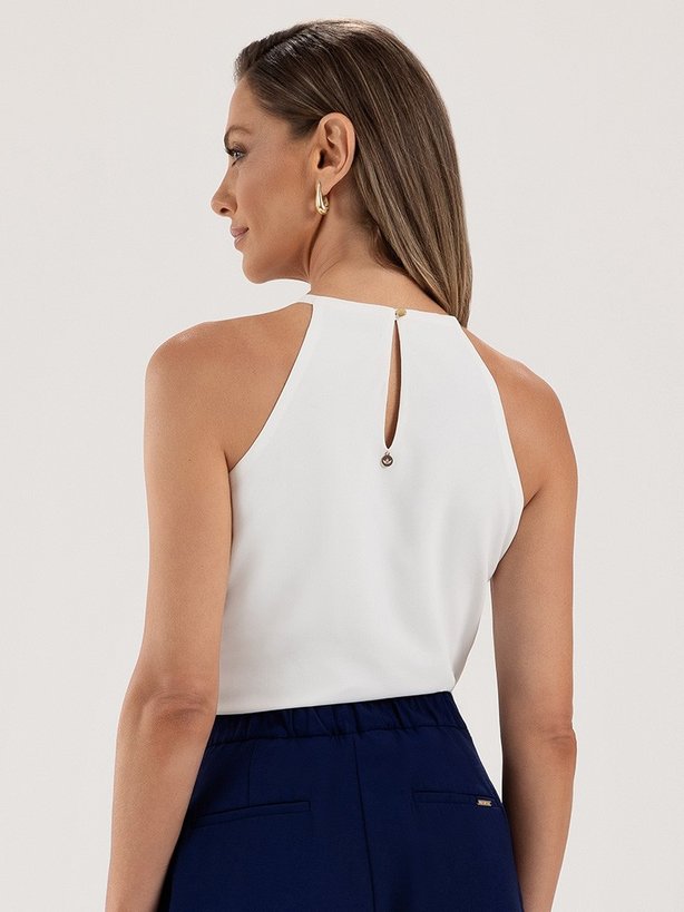 Com detalhes que a tornam única e cheia destilo para transitar desde reuniões mais formais as eventos e festas, a Regata Off White Ivy conta com detalhes que a tornam única. Possui cava americana para trazer o foco principal para a região do decote que possui o aviamento canutilho em dourado, entregando toda a sofisticação da marca, ainda na região frontal, a regata conta com pences na região do busto. Nas costas ainda há detalhes que não passam despercebido. Possui fechamento através botão e placa de metal ambos banhados a Ouro, há ainda, uma abertura em gota para facilitar e trazer conforto para o uso. Aposte em peças sofisticadas, os detalhes no decote vieram para substituir a elegância das joias, podendo ser usado de forma mais básicas até as mais elaboradas para eventos e festas.