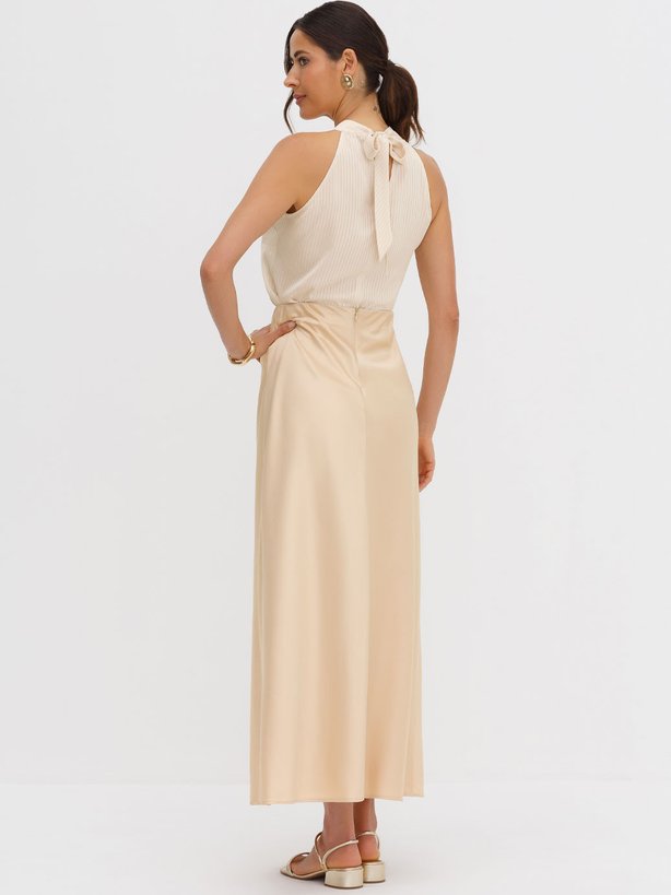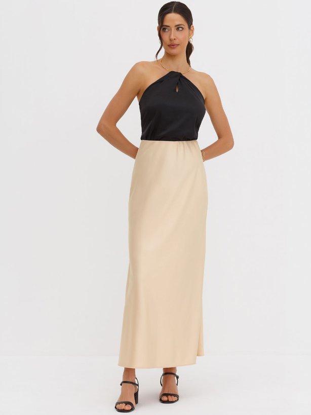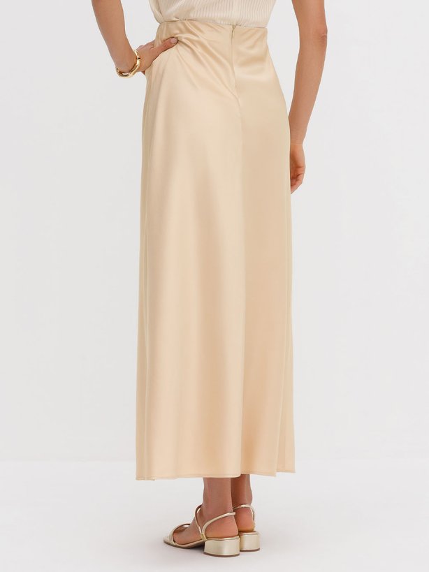 A saia Meire aposta na sofisticação da alfaiataria aliada à fluidez do crepe, criando uma peça versátil e elegante. Confeccionada em tecido acetinado que proporciona caimento leve, praticidade e não amassa com facilidade, sendo ideal para acompanhar a rotina com conforto e estilo. Com modelagem longa e levemente ajustada ao quadril, garante movimento e feminilidade à silhueta. Na cor bege, transmite elegância e sofisticação, permitindo múltiplas combinações. Clássica e moderna ao mesmo tempo, pode ser usada em produções mais sofisticadas, coordenada com blusas leves, camisas de alfaiataria ou regatas de tecido fluido.