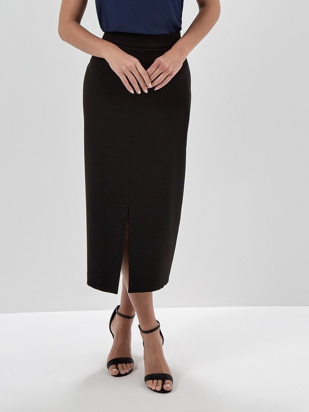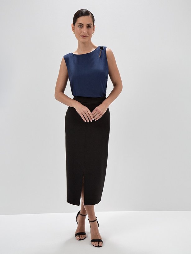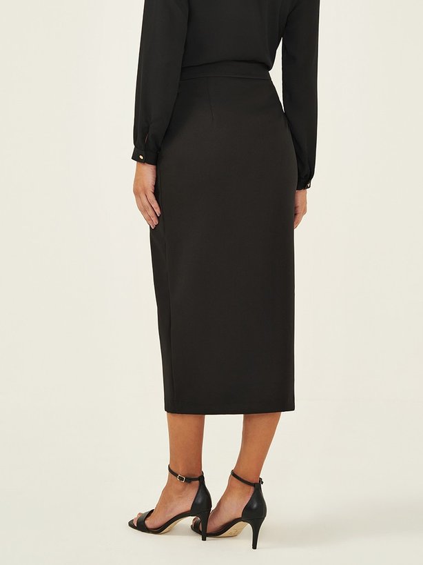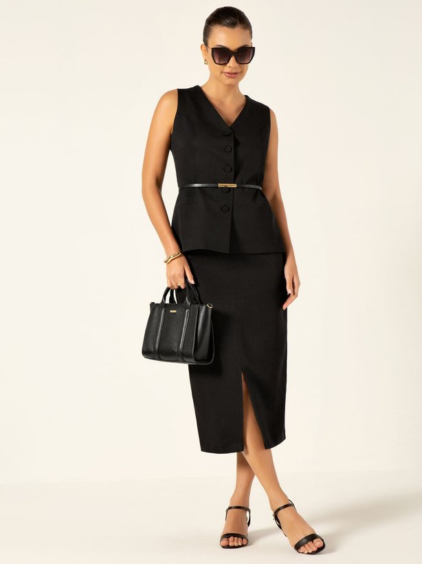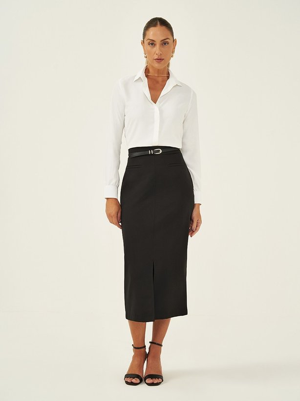 Saia Longuete de Alfaiataria Preta Rubia - A Saia Rubia é confeccionada em tecido de alfaiataria que contém elastano em sua composição proporcionando conforto ao vestir. Possui zíper invisível na lateral para melhor ajuste da peça. Sua modelagem é longuete e conta com fenda frontal para melhor mobilidade e conforto. Apresenta ainda falsos bolsos frontais embutidos. A cintura é alta e o cós é limpo, garantindo um visual discreto. Na parte traseira do cós contém placa personalizada da marca e pences que proporcionam uma melhor vestibilidade.