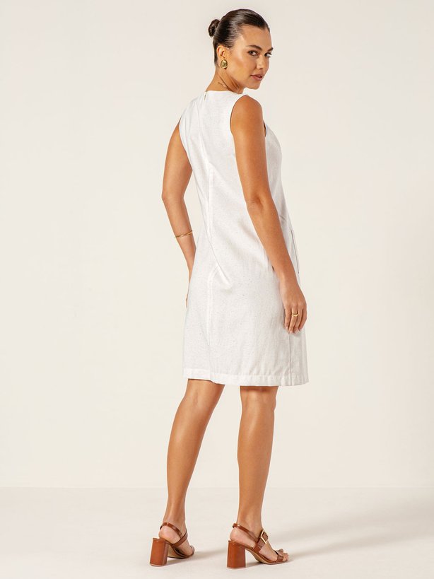 O Vestido Judy é confeccionado em Viscose Fluid com linho em sua composição, resultando em uma base levemente estruturada, de toque macio e caimento fluido. A textura sutilmente rajada, característica do linho, confere sofisticação e um visual naturalmente elegante à superfície do tecido. Seu design conta com modelagem solta, sem mangas e decote redondo, oferecendo um caimento confortável e versátil. Na parte frontal, apresenta recortes princesa que garantem um ajuste diferenciado no busto, enquanto o falso fechamento com botões rajados, em tons de bege, e os bolsos sobrepostos completam o visual funcional e estético. O fechamento é feito por zíper invisível na parte central das costas, garantindo um acabamento clean e discreto.