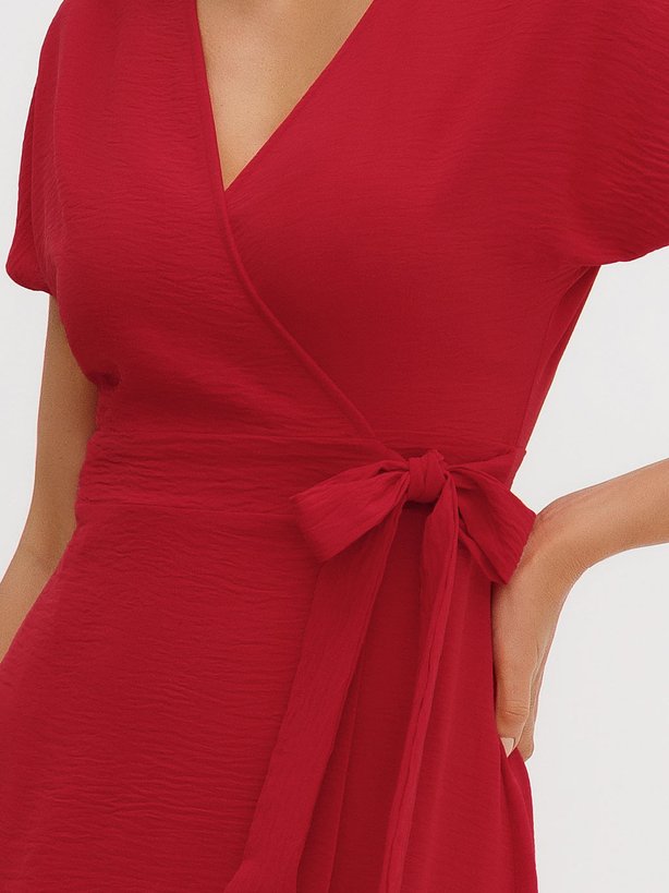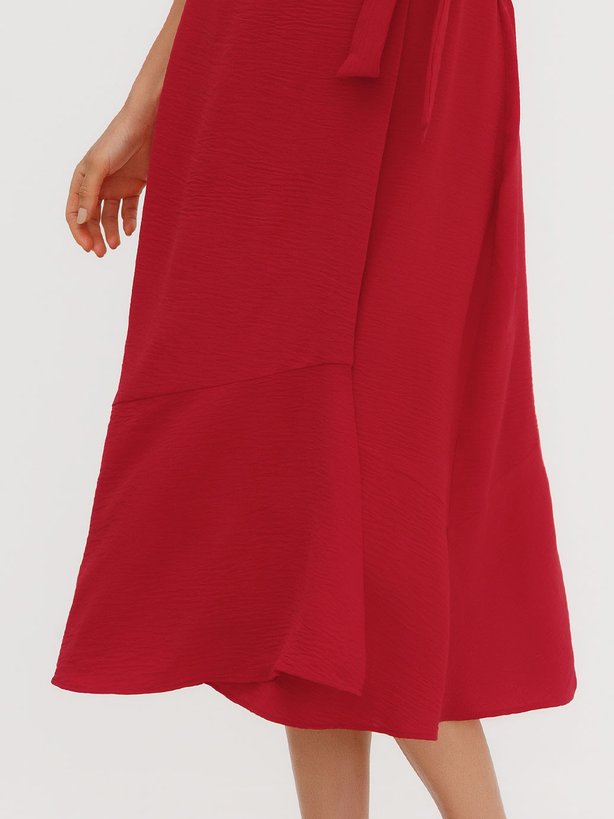 O vestido Noelia é uma peça que traduz feminilidade e movimento em cada detalhe. Confeccionado em tecido leve e fluido, garante caimento confortável e sofisticado, perfeito para diversas ocasiões. Seu design apresenta decote em V transpassado, que valoriza o colo elegantemente, além de faixa para amarração na cintura, que permite ajustar a silhueta com delicadeza. A saia com recorte assimétrico e babado na barra traz dinamismo e fluidez ao visual, criando um efeito moderno e encantador. Em tom vibrante de vermelho, a peça transmite confiança, atitude e elegância, sendo ideal tanto para produções diurnas com sandálias mais leves quanto para eventos noturnos, combinada a acessórios sofisticados.