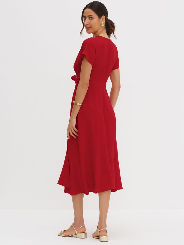 O vestido Noelia é uma peça que traduz feminilidade e movimento em cada detalhe. Confeccionado em tecido leve e fluido, garante caimento confortável e sofisticado, perfeito para diversas ocasiões. Seu design apresenta decote em V transpassado, que valoriza o colo elegantemente, além de faixa para amarração na cintura, que permite ajustar a silhueta com delicadeza. A saia com recorte assimétrico e babado na barra traz dinamismo e fluidez ao visual, criando um efeito moderno e encantador. Em tom vibrante de vermelho, a peça transmite confiança, atitude e elegância, sendo ideal tanto para produções diurnas com sandálias mais leves quanto para eventos noturnos, combinada a acessórios sofisticados.